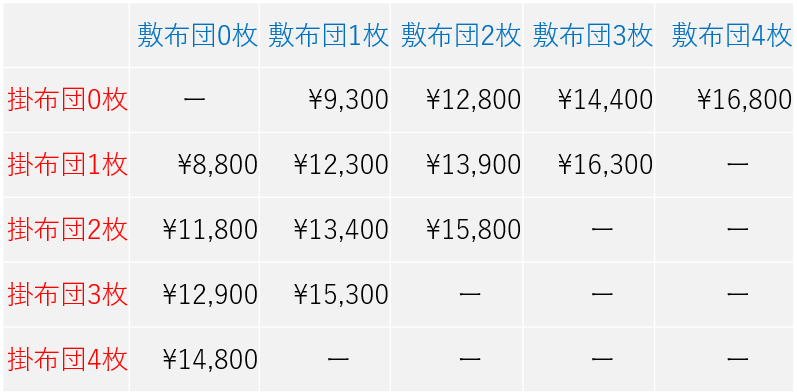敷布団、掛け布団のあるなしで値段が変動します。公式ページではシュミレーションできるので事前の料金が把握しやすいですよ。